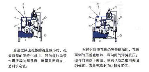 當通過限流孔板的流量減小時,孔板兩側的壓差也減小,導向閥的彈簧作用使用導向閥開啟,流量重新增大,達到設定值。當通過限流孔板的流量增加時,孔板兩側的壓差也增加,導向閥的彈簧受壓,使用導向閥趨于關閉。主閥也隨之推向關閉的位置,流量漸減小而達到設定值。